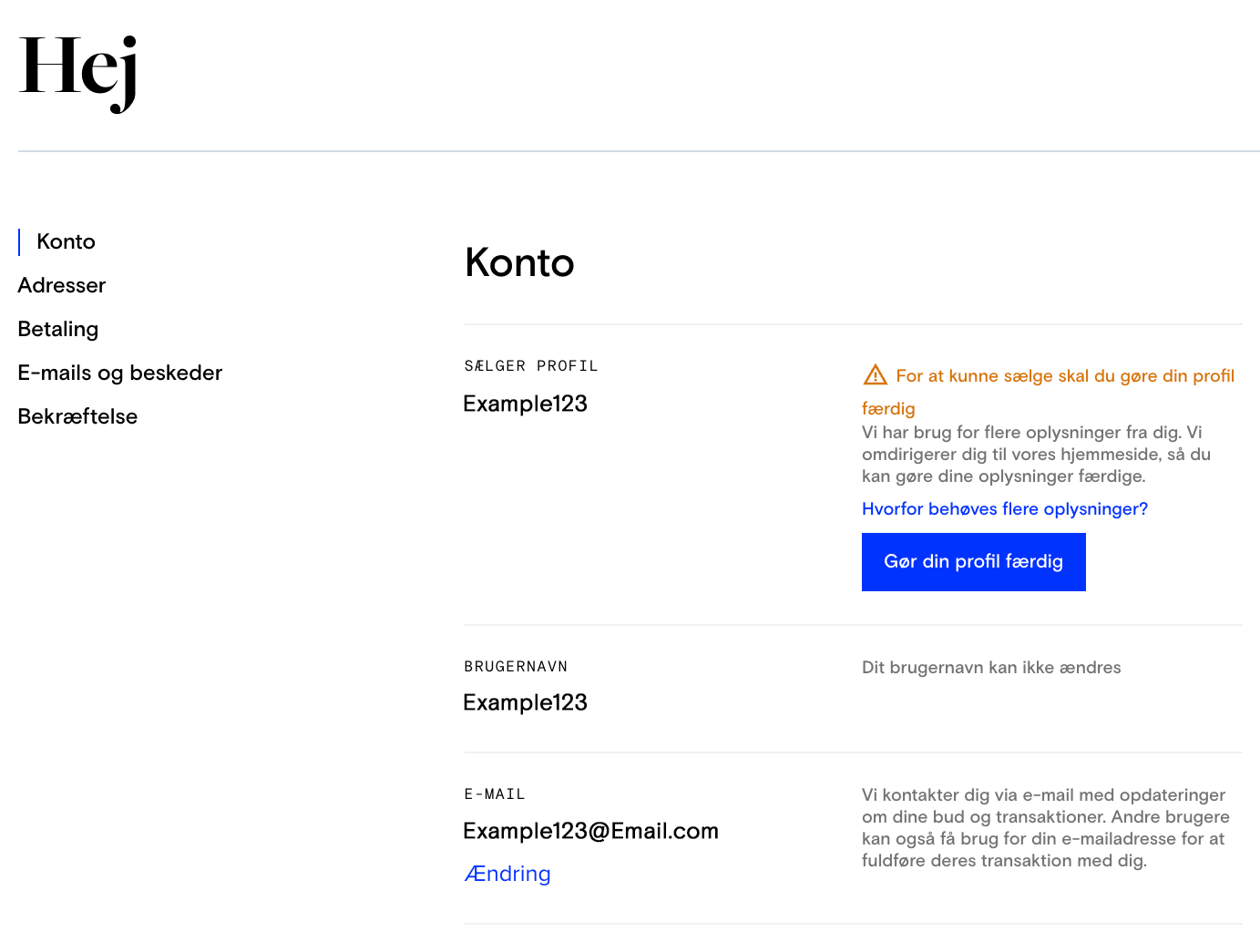 Du kan tilføje en faktureringsadresse. Hvis du er en professionel sælger, der sælger som en juridisk enhed, og du ikke tilføjer en faktureringsadresse, vises din leveringsadresse offentligt på siden "Solgt af" i henhold til lovgivningen. Når du tilføjer en faktureringsadresse, erstatter den din leveringsadresse på disse sider.