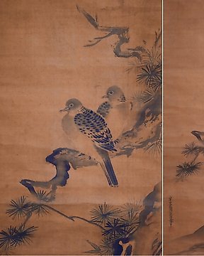 Ζωγραφική με μελάνι - Πεύκο και 2 περιστέρια - κρεμαστό πανί. - Χειροποίητα ζωγραφισμένο με το χέρι σε μετάξι. - “Yukawa Mingen Masamori 湯川民源正盛” - Ιαπωνία - Edo Period (1600-1868)