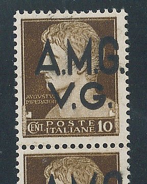 Τεργέστη-Ζώνη Α - 10 c. bruno n. 1ε, με διπλή υπερτύπωση, σε κάθετο ζεύγος.
