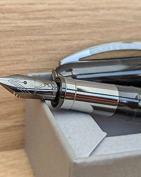 Hold your fountain pen nib at a 45-50-degree angle against the writing surface, once you have fitted the cartridge. Make sure the tines of your fountain pen lay equally on the writing surface and avoid twisting the pen in your hand while you write. Your pen may lose contact with the paper and skid off your writing surface without these actions.