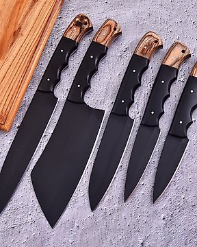 Cutlery set (5) - Handmade Stainless Steel Chef Knife Set: Color wood & Strong Olive Wood Handles blackened blades - Forged Chef Knives