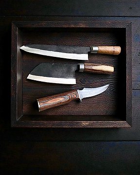 Set of THREE, Hand-Forged with Old Steel, Japanese Style Knives from Elite + Surprise Christmas gift - Kitchen knife - Chef's knife - Steel, Wood, Exquisite Set of 3, Hand-Forged Japanese OLD Steel, Vintage Knives, + Mystery surprise Christmas - Japan