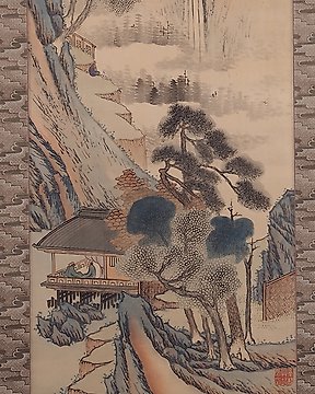 Very fine painting "Landscape with blue", signed - including inscribed tomobako - Takahashi Sohei (1804-1835) - Japan - Late Edo period