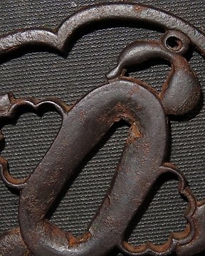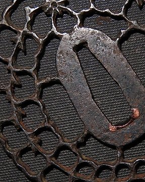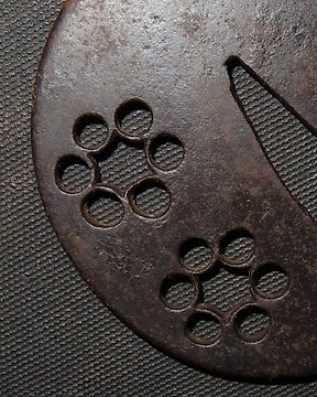 Japan Iron, Very rare iron jingasa Iron jingasa with Maru ni chigaikuginuki 丸に違い釘抜 ( a circle and a nail puller) design in gold - 13.3 cm