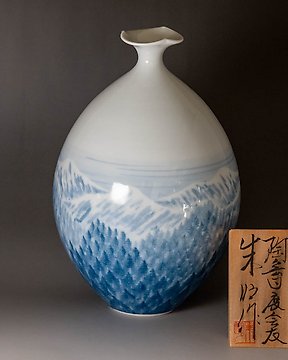 Free shipping"Soshun (Early Spring)" Sometsuke Porcelain Vessel with Mountain and Forest Motif – Fujii Shumei, - Porcelain - Fujii Shumei / 藤井朱明 (1936– ) Japanese porcelain artist working in Arita, Saga Prefecture. - Japan - Shōwa period (1926-1989)