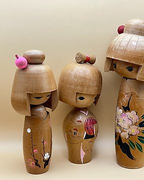 Three Vintage Japanese Bobbed-Hair Kokeshi Dolls by Munehiro, Tanaka Kojo and Takeshi - Wood - Japan - Shōwa period (1926-1989)
