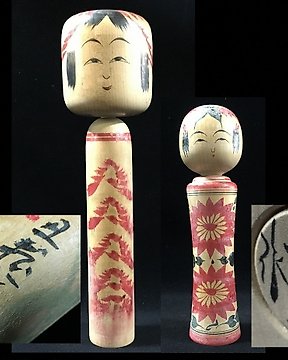 Set of 2 / Japanese Vintage Wooden Kokeshi Doll (H:18-30cm) - Wood - Signed Takahashi Toshifumi - Japan - Shōwa period (1926-1989)