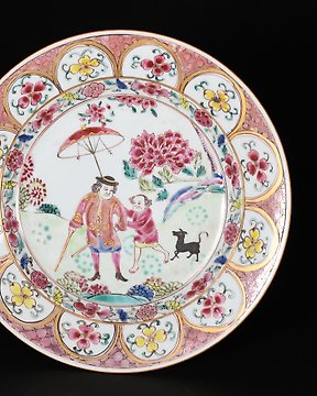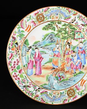 Plate - Assiette en porcelaine aux émaux de la Famille Rose à riche décor de He Xiangu et sa servante - Porcelain