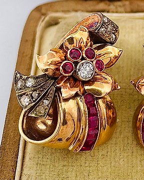 Brooch - 18 kt. 18K Yellow Gold Brooch with Diamonds & Rubies, Yellow gold