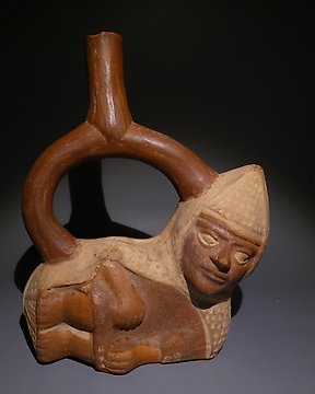 Moche, Peru Terracotta Huaco male figure with stirrup jar. 20 cm H. 400 - 800 AD. Spanish Import License - 20 cm