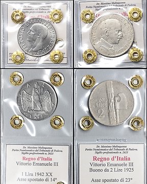 Italy, Kingdom Vittorio Emanuele III. Lotto di 2 monete con asse spostato - Errore di coniazione - 1 Lira 1942 / 2 Lire 1925 (No Reserve Price)