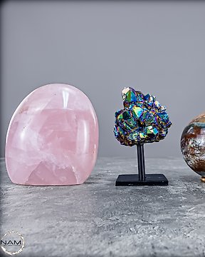 Mystical Ensemble – Merlinite Obelisk, Tourmaline Sphere, and Moonstone Freiform Madagascar full of magic and energy.- 939.22 g - (3)