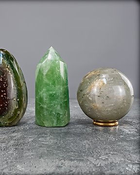 Green Harmony – Fluorite Obelisk, Green Garden Quartz Sphere and Flaky Agate with Green Quartz Madagascar full of magic and energy.- 831.22 g - (3)