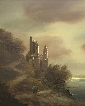 European school (XX), Circle of - Sfeervol Romantisch Kustlandschap met Ruïne in gouden lijst