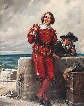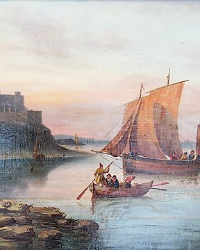 European school (XIX) - Küstenszene mit Seegelschiffen und einer Burg im Hintergrund