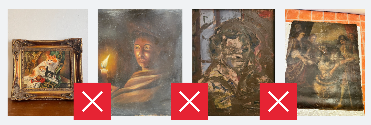 - Any restorations, repairs, or alterations to the original form (such as cropping or folding the canvas, or re-varnishing)