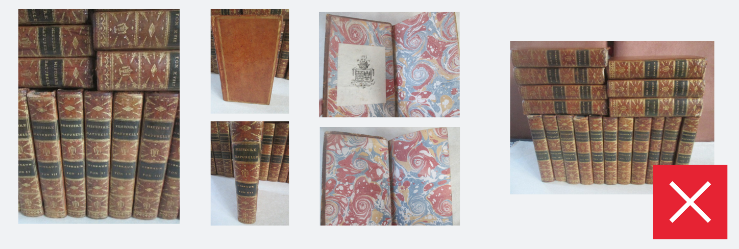 - The first example is neatly presented, showing all volumes clearly and attractively; the second is poorly lit, disorganised, and does not show the complete set.