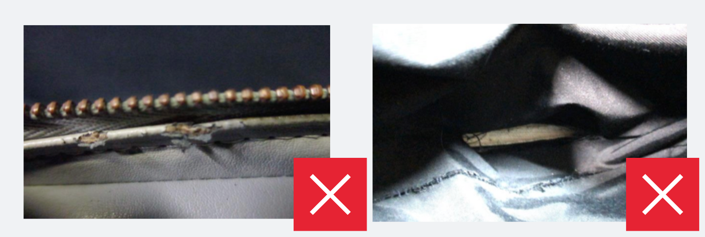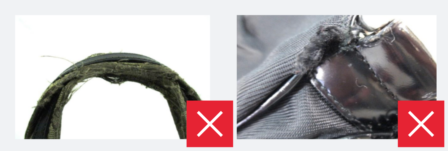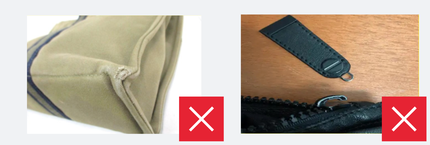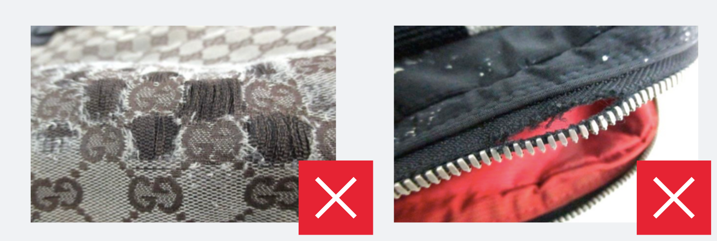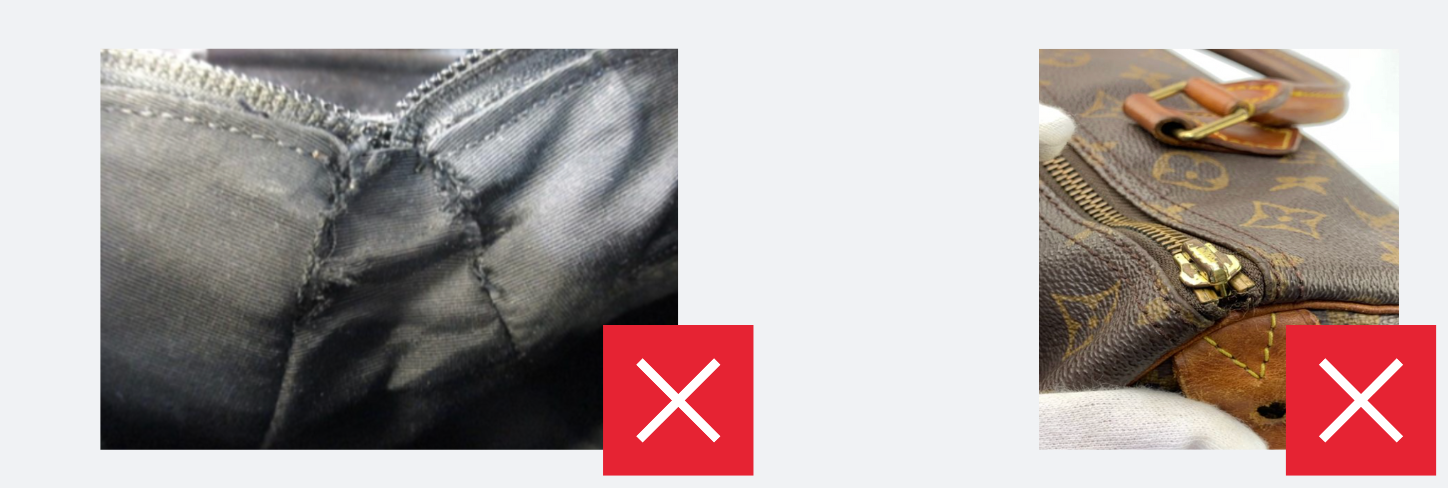 - Poor/Unwearable condition: shredded or ripped handles, ripped or split interior, split zipper, severely loose stitching, damaged or missing hardware, torn corners
