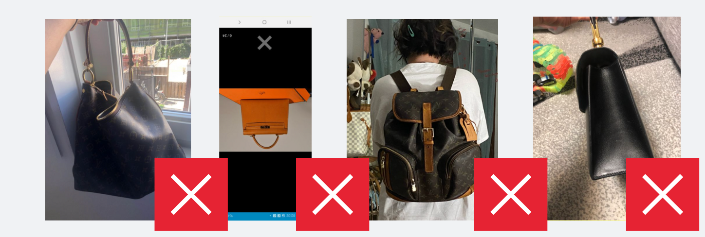 Tip: Fill the bag before shooting to show shape. Avoid photos with people, selfies, or screenshots, use mannequins or white gloves to show handling professionally. Use a neutral background (white or black), avoid low-quality or stock images, and aim for natural lighting. Find here more tips on how to take professional photos.