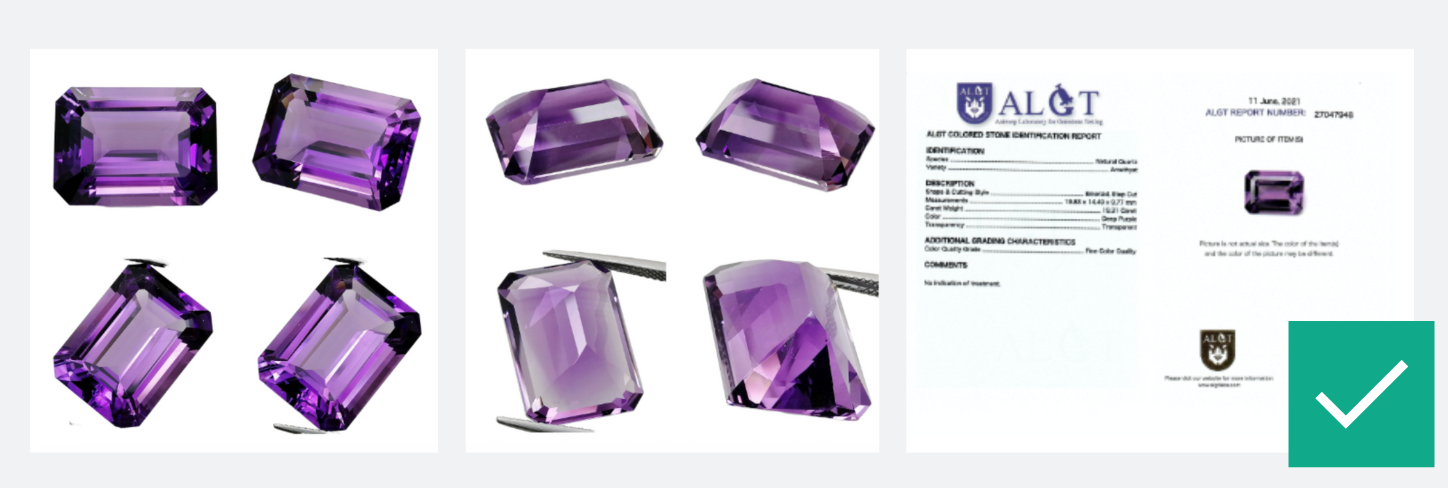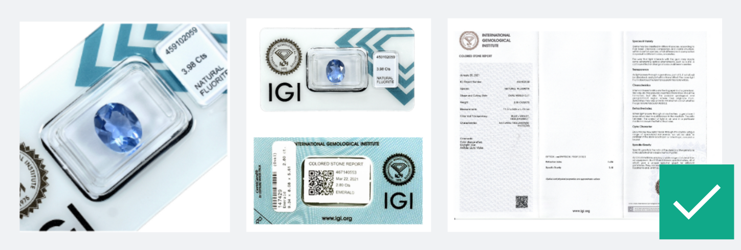 - Example for sealed gemstones (front and back seal images), close up gemstone images and certificate