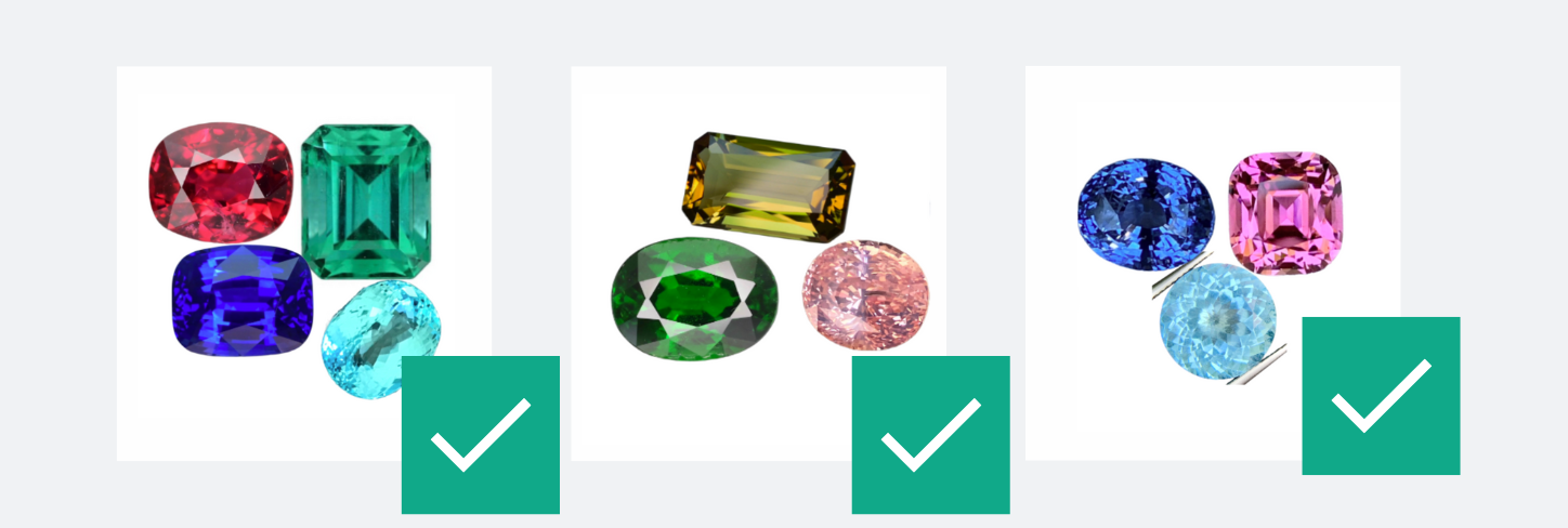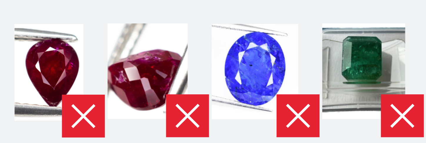 - Beryl Emerald, Corundum Ruby and Sapphire, Chrysoberyl, Tourmaline Paraiba, Grandidierite (only transparent) accepted >1.00 ct