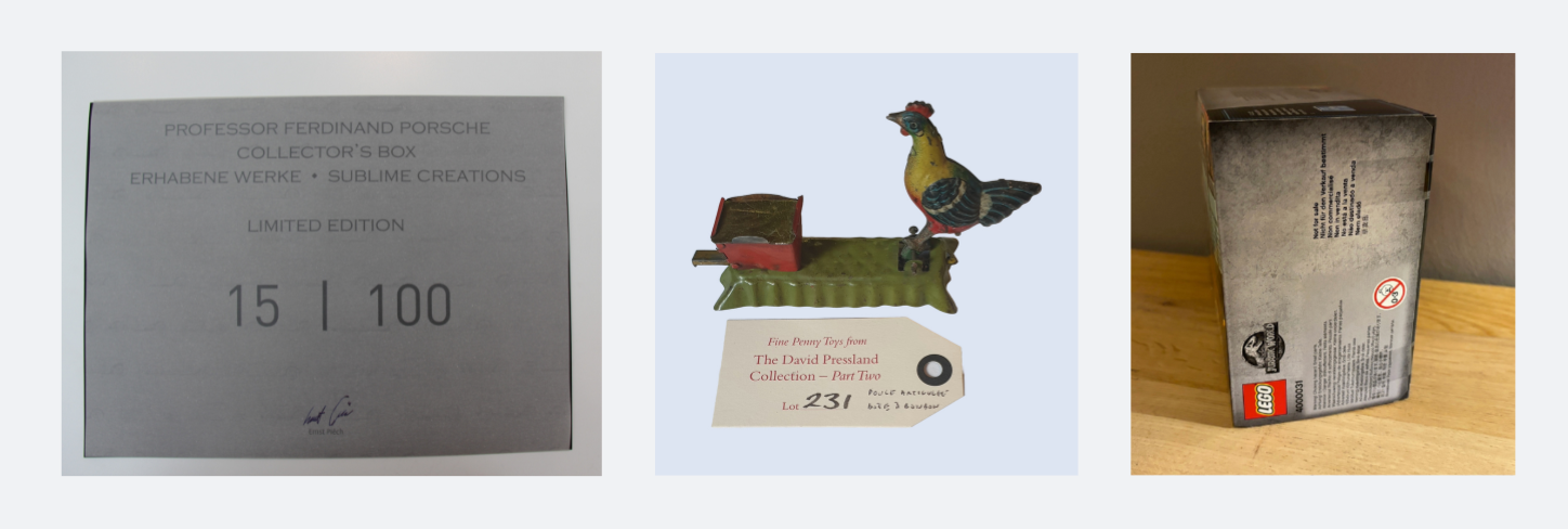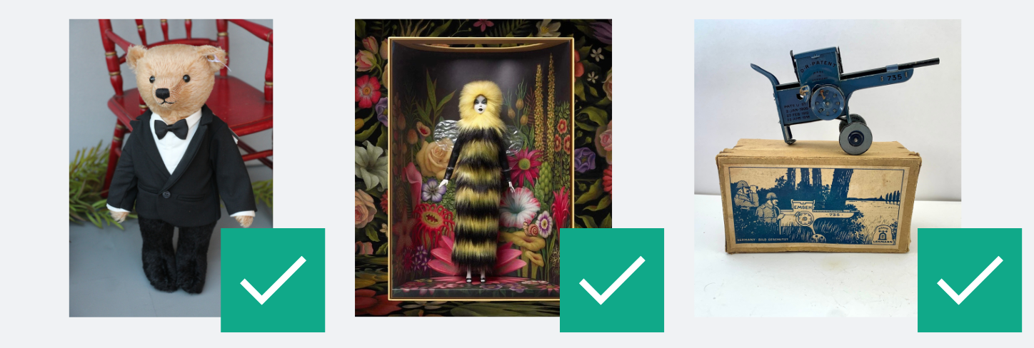 - Be of collectors interest and from a reputable brand (e.g. Steiff, Mattel, Hasbro, LEGO, Schuco, Petitcollin, NECA, Roco, Wilesco)