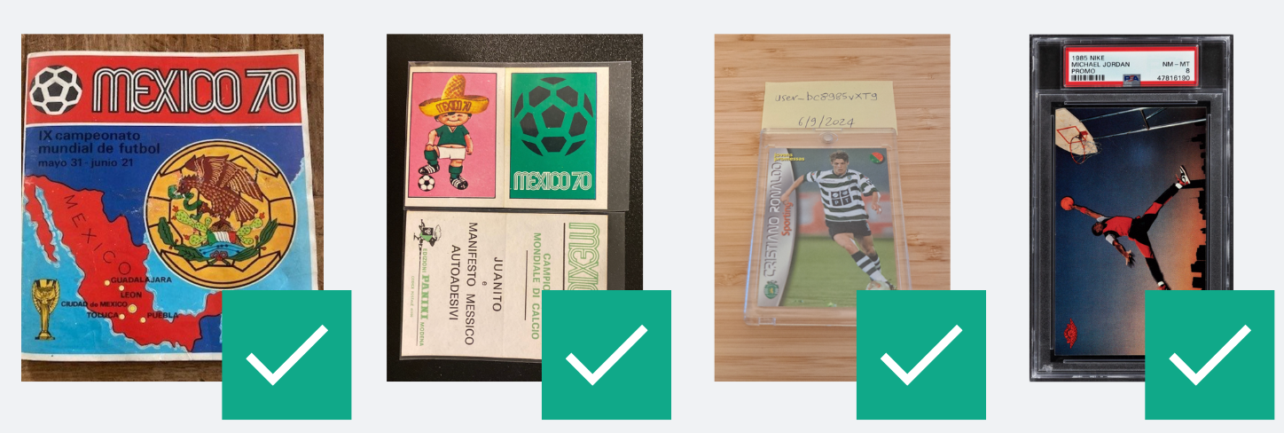 - Close-ups of grading labels, authentication marks, or serial numbers