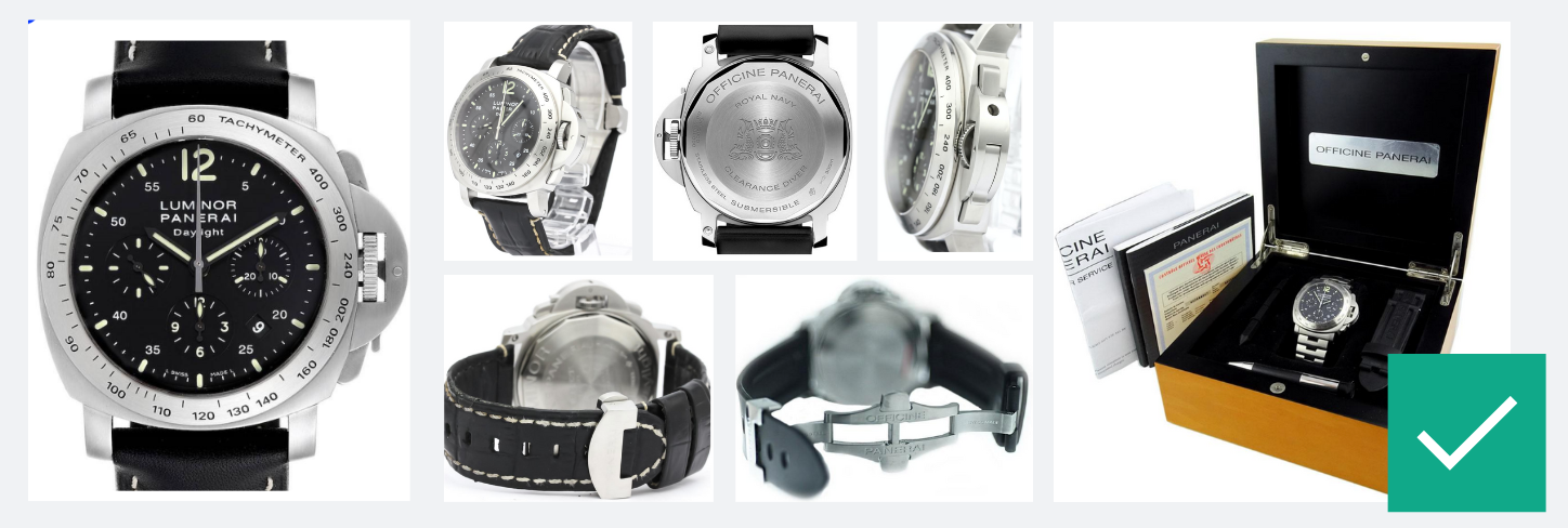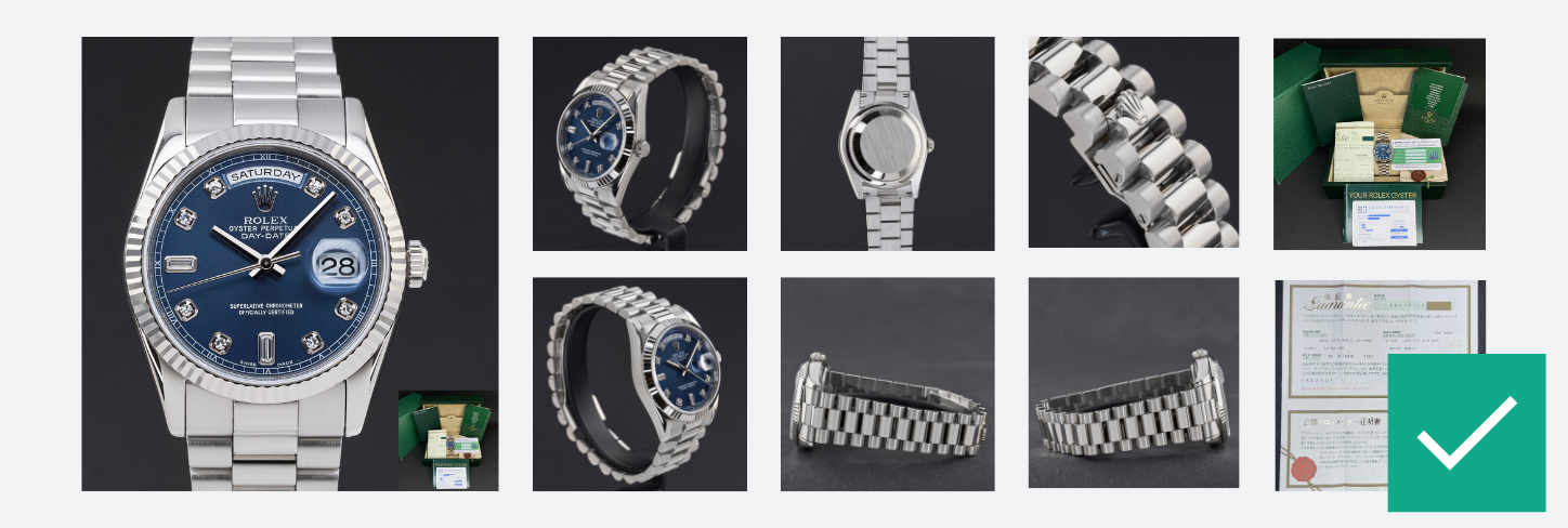 - High-quality images taken from multiple angles clearly show the watch, its condition, and all included accessories, such as the box, certificate, warranty, and documents.