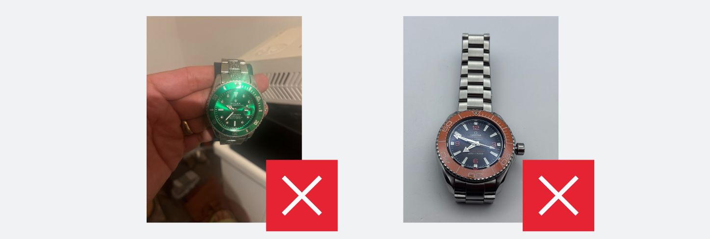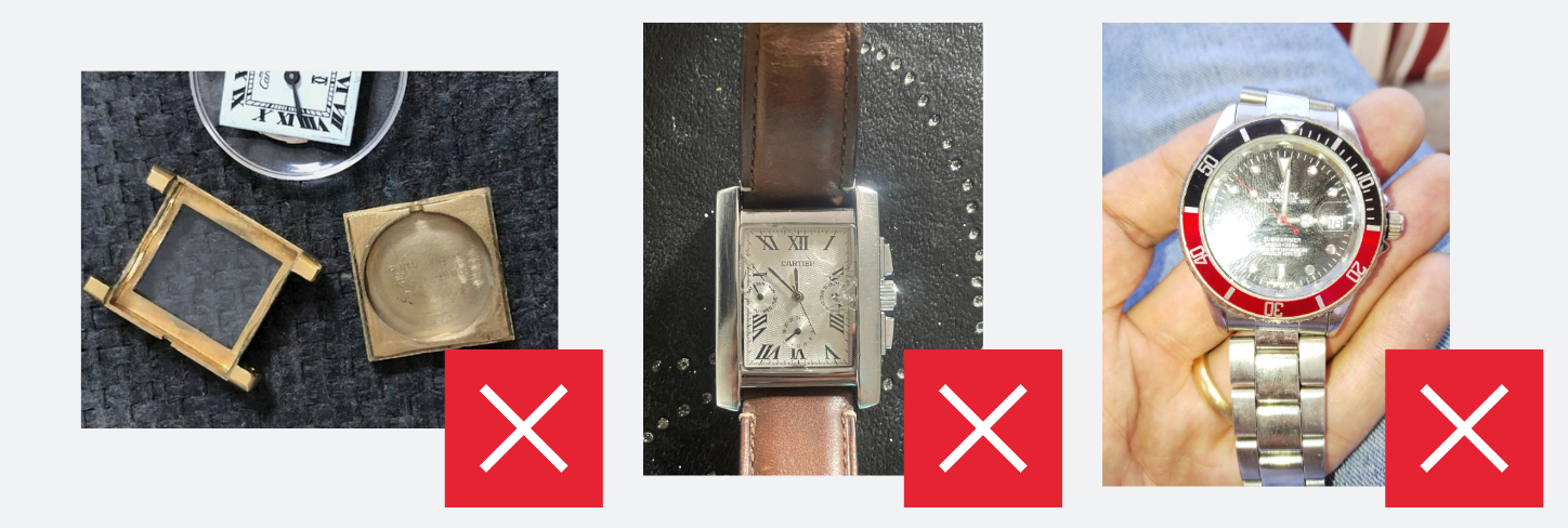 - Poor-quality images: blurry, repetitive, taken from too far away, or missing key angles, all of which make it difficult for bidders to assess the watch properly.
