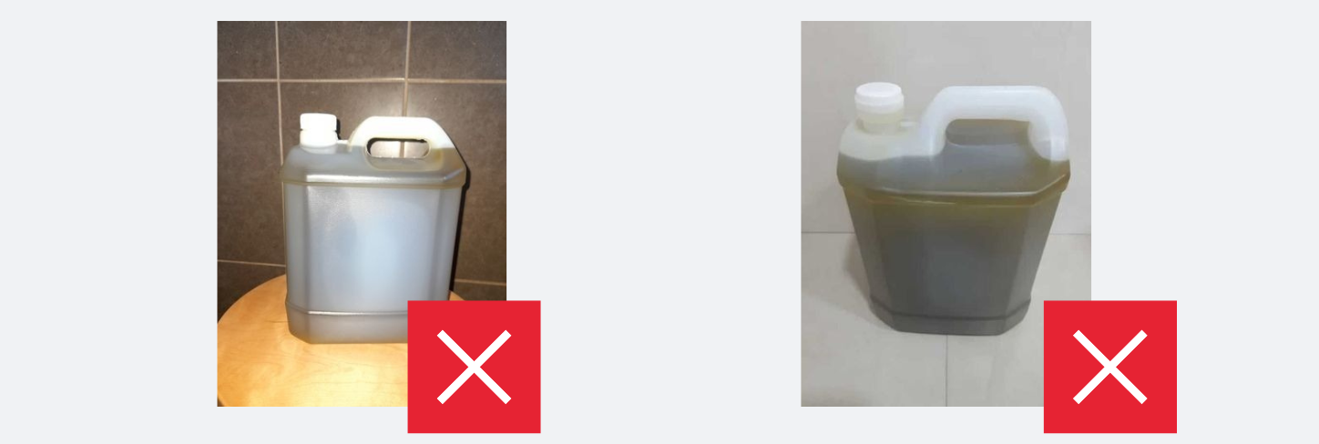 - Bottles and accessories in poor condition, with leakage, unclear labeling, or damaged seals