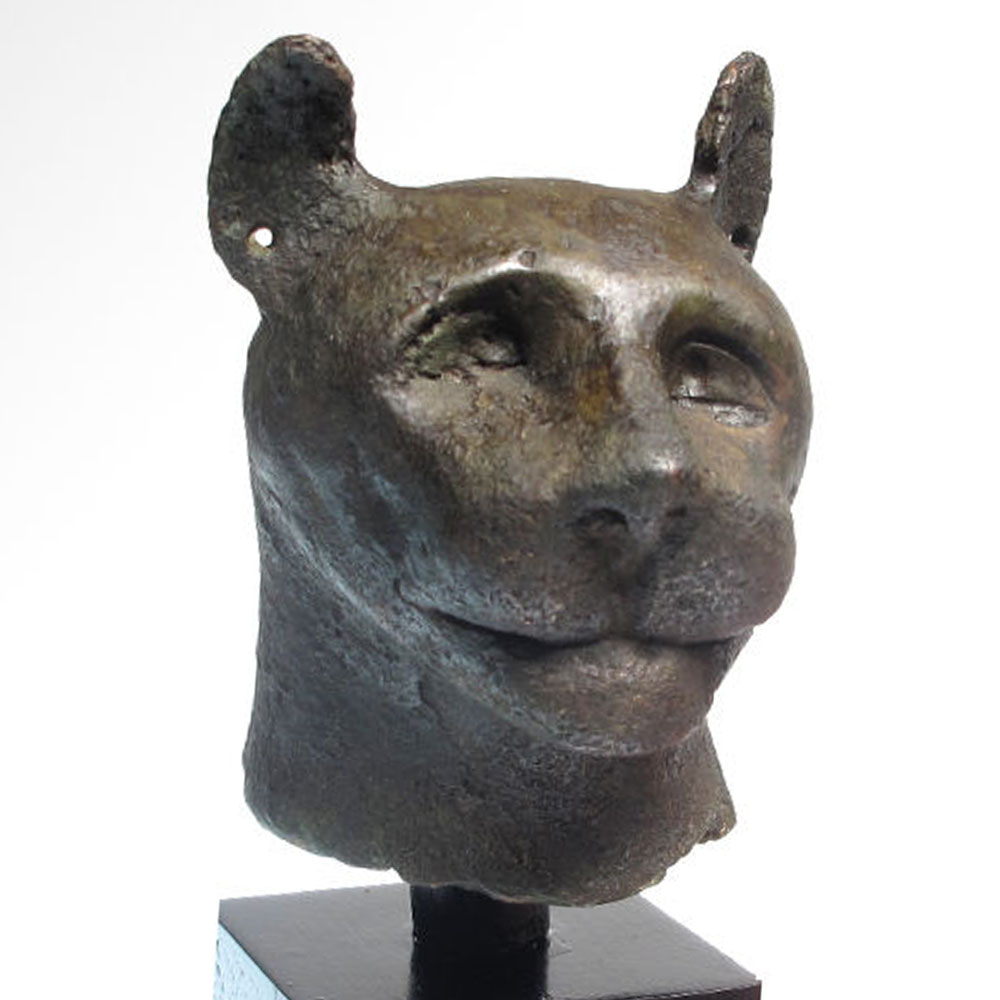 The cat or Miu was first domesticated in Ancient Egypt where in the New Kingdom of the Pharaoh’s Akhenaten and Tutankhamun it can be found in the wall paintings of noblemen assisting in hunting game and fishing. Our love affair with the cat is indeed ancient. By the Late Period, the animal cult was particularly important and the cat was worshipped as Bastet, the goddess of love, both erotic and maternal. This fine Bronze head of a cat will be appreciated by a loved one as an eternal symbol of undying affection.