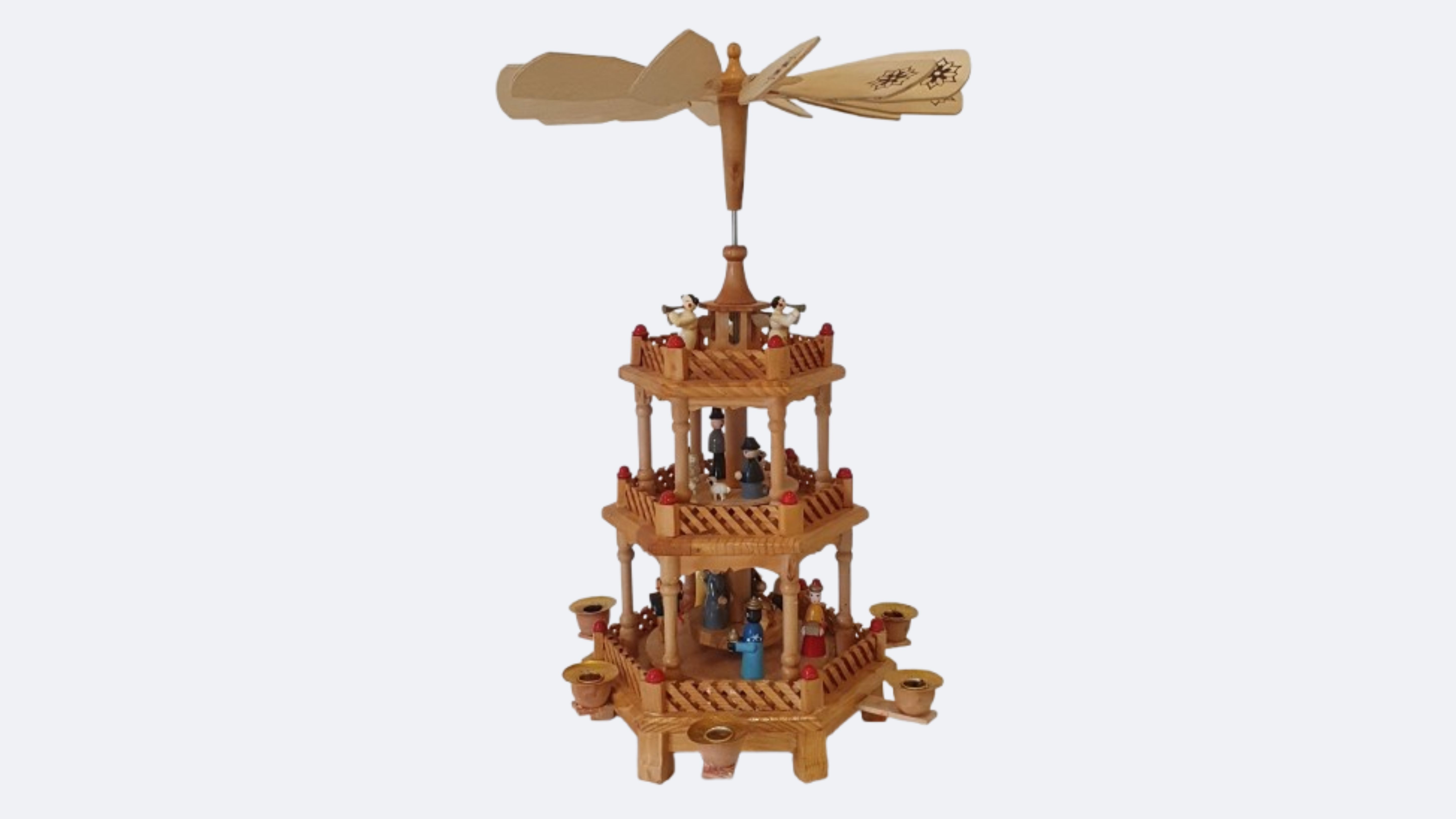 These wooden pyramid-shaped decorations have their origins in German folklore. They typically feature candle holders and a rotating central carousel powered by candle heat. The carousel often depicts nativity scenes, angels, wise men, miners, or forest animals, blending craftsmanship with holiday spirit.