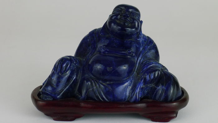 Lapis lazuli is a deep blue semi-precious stone, admired for the intensity of its blue colour, thanks to the blue lazurite it contains. The gold flecks and inclusions associated with lapis lazuli are due to the presence of pyrite. Such carvings in blue stone are frequently confused with sodalite - named after its high sodium content. Sodalite is recognised for its darker, less-intense blue colour, and inclusions or streaks in white calcite. Mines in Afghanistan were and remain today a prime source for lapis lazuli.