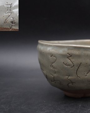 Chawan - Tea bowl with poem by Otagaki Rengetsu, handwritten waka carving, tea ceremony utensils - PotteryStarting bid€1