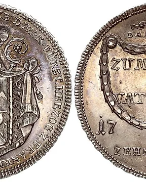Bamberg, Bistum Franz Ludwig von Erthal 1779-1795. Konv.-Taler 1795 Kontributionsprägung aus dem Tafelsilber des Fürstbischofs. Seltene Variante, feine Patina