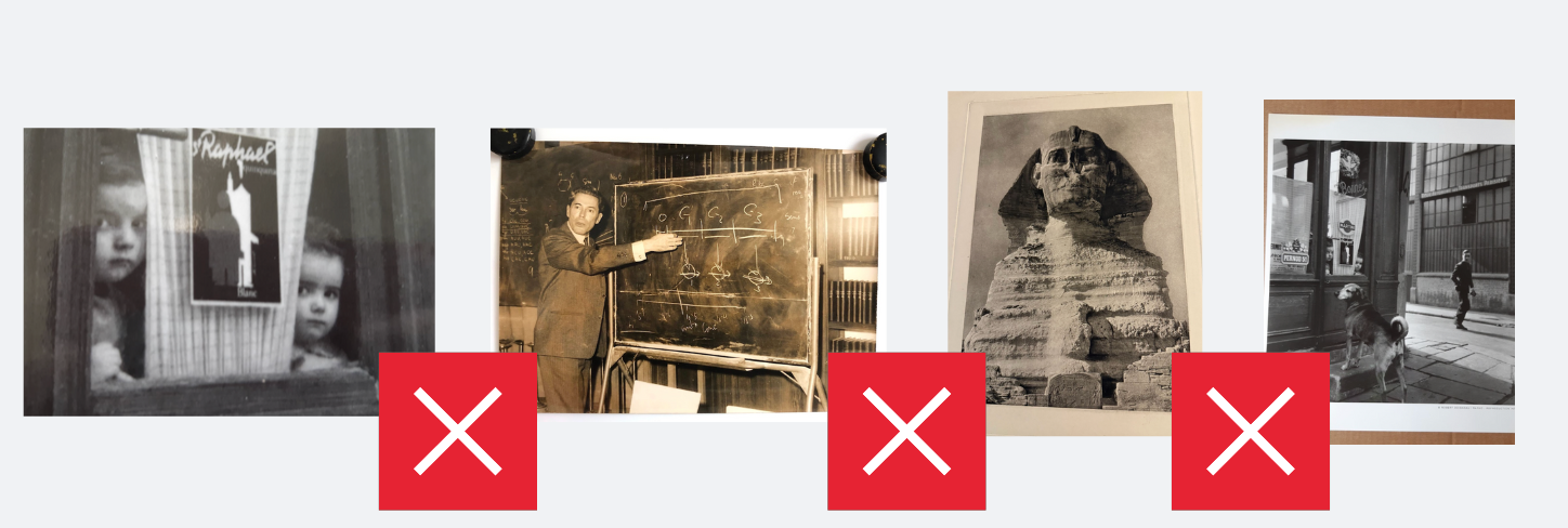 - Fotografías claramente atribuidas al fotógrafo (firmadas, impresas o selladas)