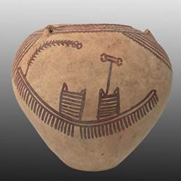 Desde los primeros pobladores del valle del Nilo, el invasivo desierto nunca estaba lejos de las mentes de los egipcios de la antigüedad. Estamagnífica vasija de cerámica decorada refleja el contraste entre el desierto, representado por el material cerámico color beige del recipiente, y el fértil valle del Nilo, representado como una elaborada barcaza ceremonial con múltiples remos, dos cabinas para albergar un dios, rey o noble, y estandartes cuyo significado se ha perdido. Las líneas en zigzag que forman la decoración del resto el cuerpo de la vasija representan la abundancia de la fertilidad del agua. Este recipiente es un ejemplar magníficamente conservado y procede de los inicios de la civilización egipcia.