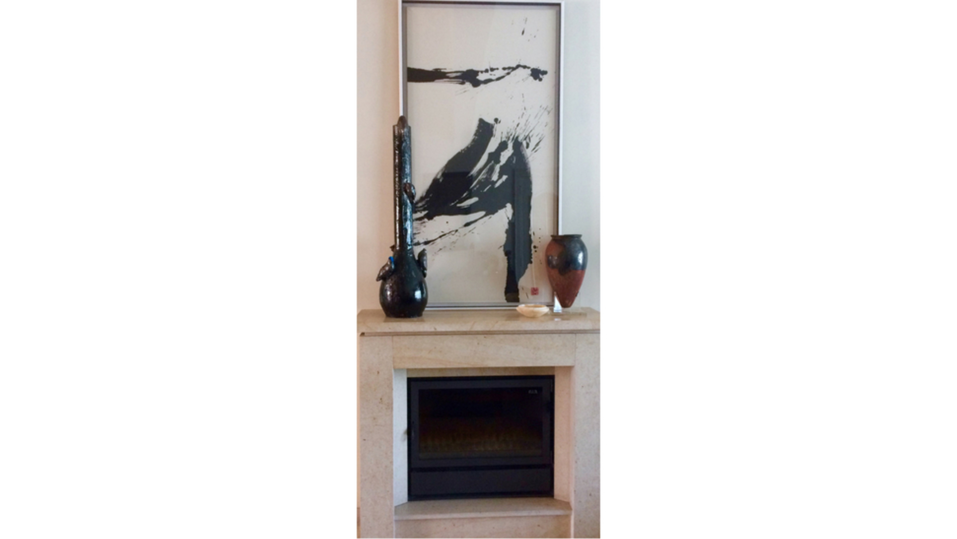 Interior de un hogar moderno francés con una chimenea con una pintura de Tse-Yun Yang (°1954),un conocido maestro chino moderno. A la izquierda: una obra de arte, parte de 'les Cruches Cassées', del escultor internacionalmente aclamado Johan Creten (°1963). Estas dos piezas dialogan con un enorme jarrón Nagada Icon parte superior negra de Egipto (aprox. 4000-3500 a. C.) y un pequeño plato egipcio de alabastro del Imperio Antiguo (dinastías III-VI, aprox. 2649-2150 a. C.). Esta imagen muestra lo maravillosamente modernas que son las formas antiguas, que han sobrevivido al tiempo sin perder nada de su magia. Combinan muy bien con el arte moderno, y a veces incluso reflejan las obras modernas o son elementos perfectos para tener junto a ellas.