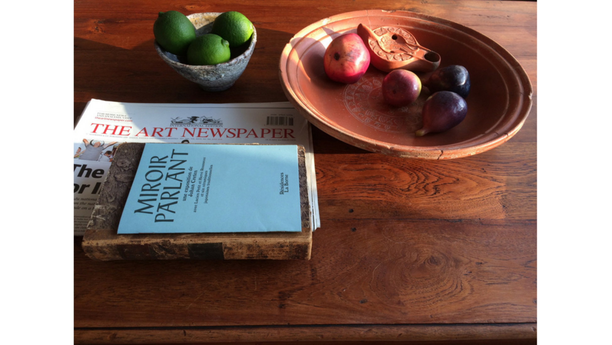 Una mesa de café para coleccionistas de "la vida real" en algún lugar del sur de Francia. erca de un moderno cuenco de cerámica hecho por Lucien Petit (1957) hay un cuenco romano antiguo, grande y restaurado, de terra sigillata con una lámpara de aceite que representa un león saltando (ambos de los siglos II-IV a. C.) Ideal para poner la fruta y dar un toque histórico a este rinconcito de la casa.