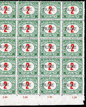 Fiume 1915 - Segnatasse - Bloque angular de 25 ejemplares del valor de 2ct. verde y rojo, goma intacta. - Sassone n. 5
