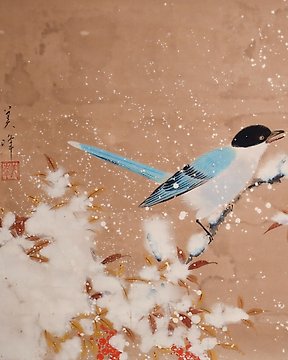 Talvimaisema - Nandina domestica ja pieni lintu lumessa - roikkuva käärö - Käsinmaalattu paperille - Biho 美峰 - Japani - Shōwa period (1926-1989)