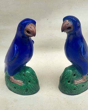 Veistos, Pair of figurines representing parrots standing on a green base - 21 cm - Keraaminen, Lasite