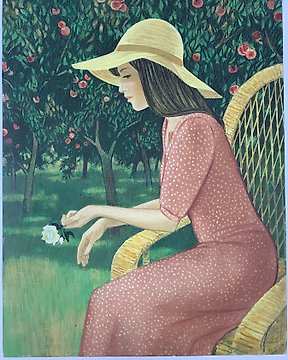 Yves Ganne (1931-2019) - Portrait d’une Jeune Fille à la Fleurs dans un paysage au pommier (Vendu sans prix de reserve).