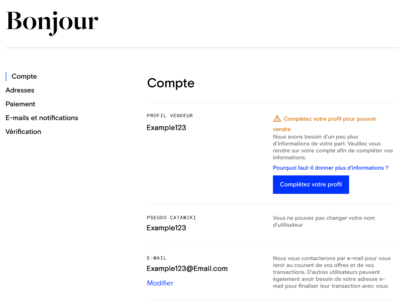 Pour activer votre compte, vos informations doivent être complètes. Si vos informations sont incomplètes, vous ne pourrez pas enchérir, acheter ou vendre sur Catawiki.