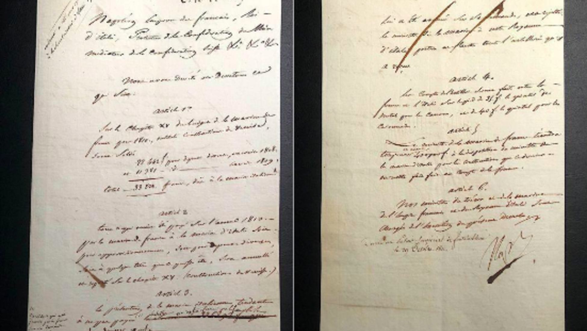 Ce magnifique manuscrit, annoté et signé par l’Empereur, est le brouillon d'un décret relatif au paiement de dépenses militaires en Italie. Ce document a été adressé à l’Empereur pour qu’il l’approuve, ce qui explique pourquoi il présente de si nombreuses annotations / corrections.