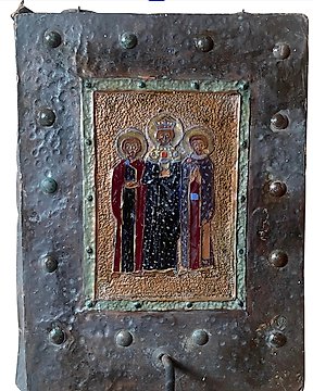 Icona - Crocifissione di Cristo, Deesis, Cinque santi, San Giorgio sauroctono, San Giovanni Battista, San Giovanni il Precursore, Madre di Dio, Pokrov della Madre di Dio, Tre Santi Gerarchi, San Pantaleone, Santa Parascheva - Ottone, Bronzo, Smalto - Collezione di 45 icone