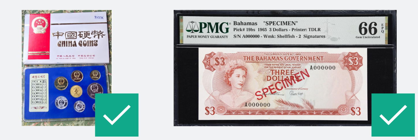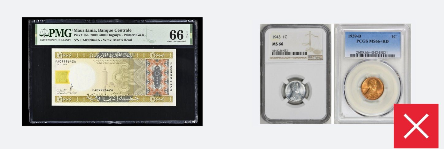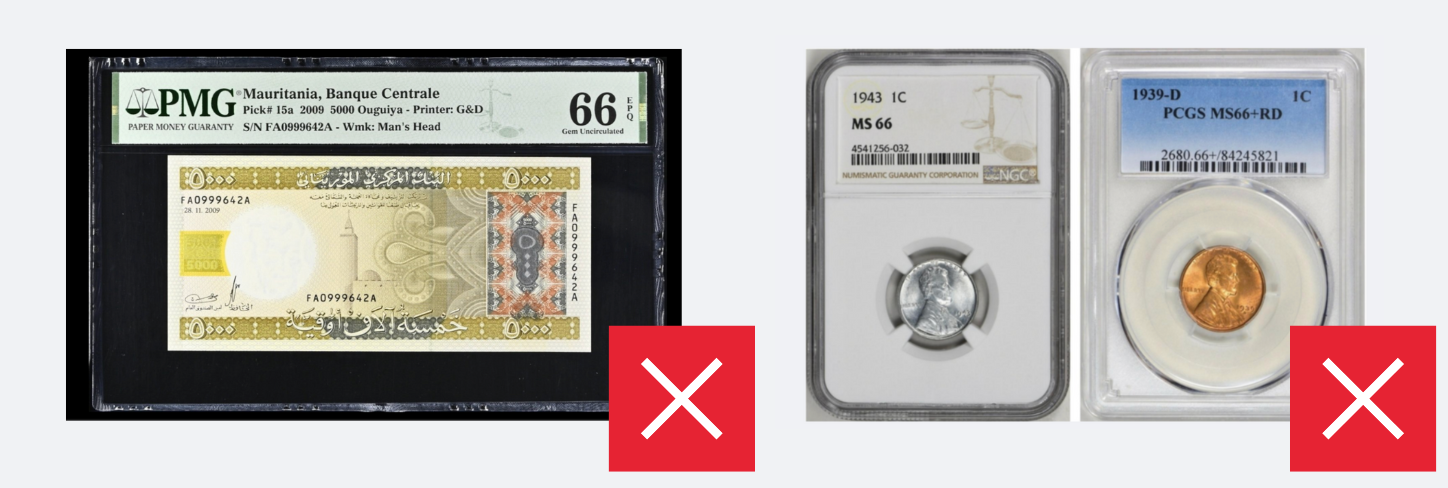Per allineare le nostre linee guida alle politiche dei nostri fornitori di servizi, monete, medaglie e banconote da Cuba, Iran, Corea del Nord, Siria e dalle regioni di Crimea, Donetsk e Luhansk non possono essere incluse. Tuttavia, monete antiche da regioni o imperi storici che si sovrappongono geograficamente a questi territori moderni — come le monete achemenidi — possono essere incluse, a condizione che soddisfino tutti gli altri criteri di presentazione.