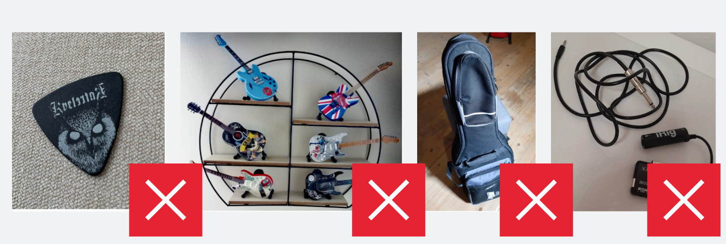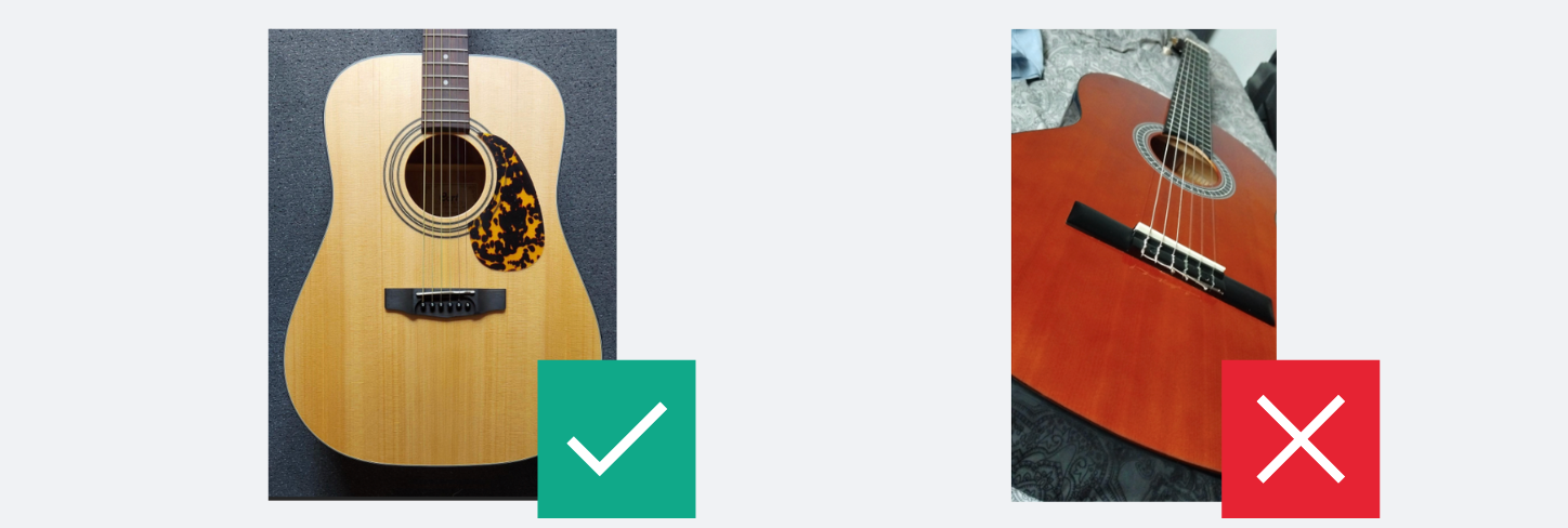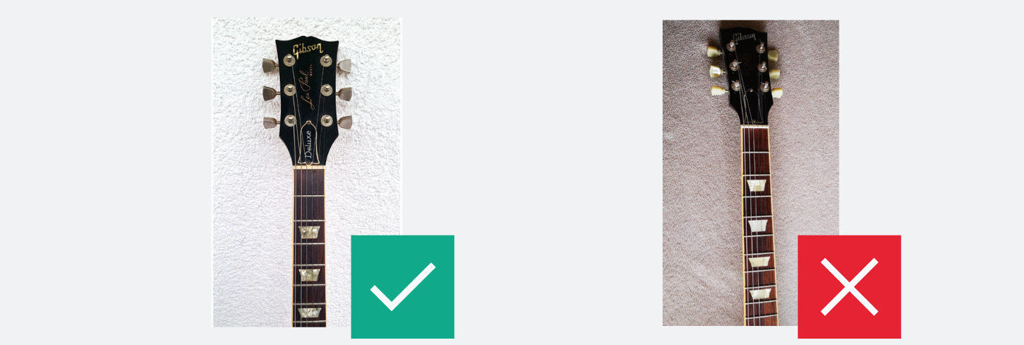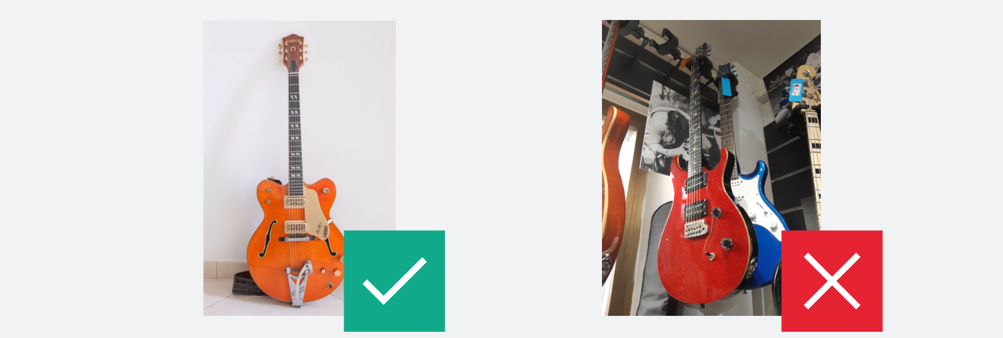 - L'immagine a sinistra è ben inquadrata, illuminata uniformemente e scattata da un angolo frontale, rendendo facile valutare la condizione della chitarra. L'immagine a destra è mal composta, inclinata e ha uno sfondo disordinato che distrae dall'oggetto.