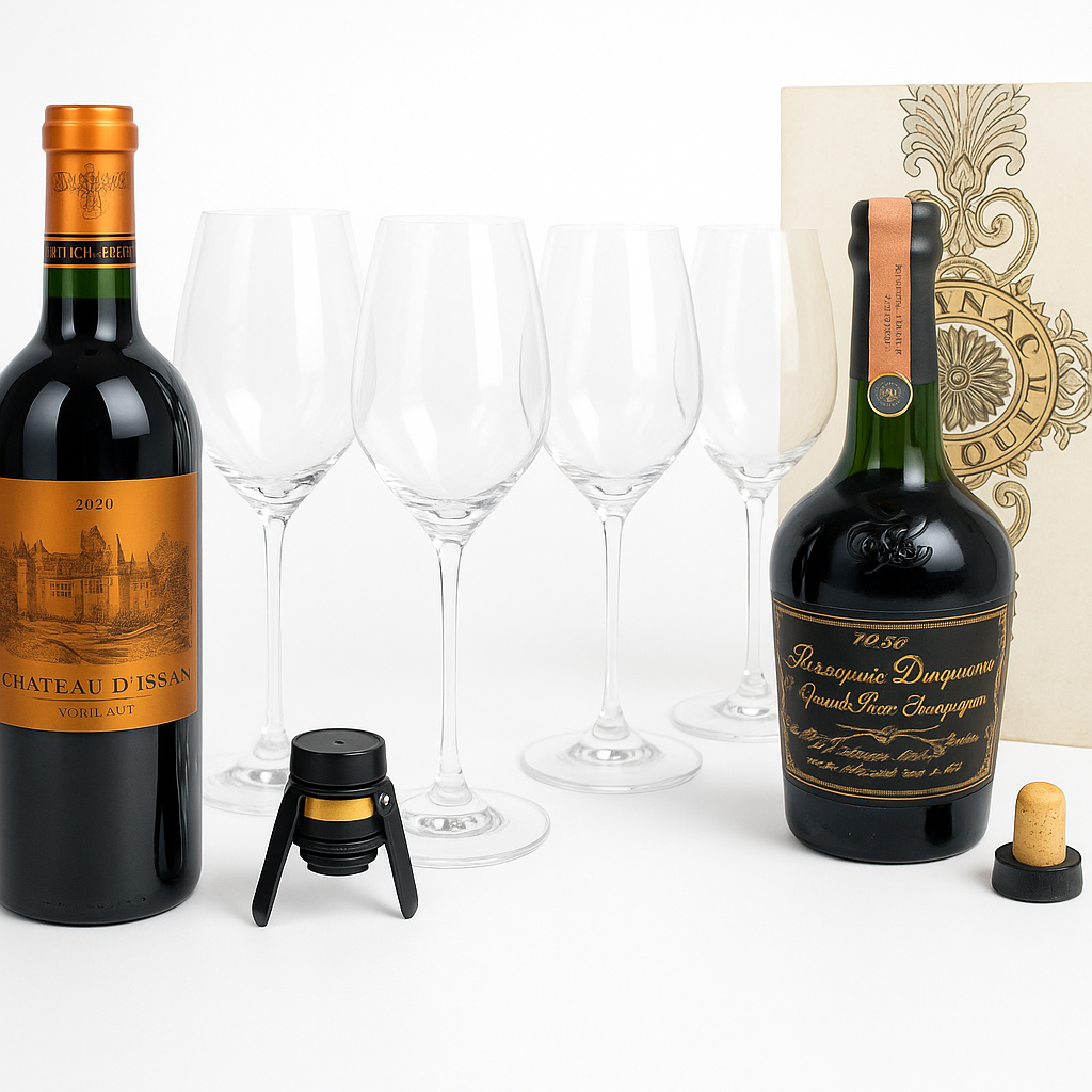 (Da sinistra a destra: Bordeaux strutturato 2020, calici Dom Pérignon in cristallo, Bisquit cognac)
