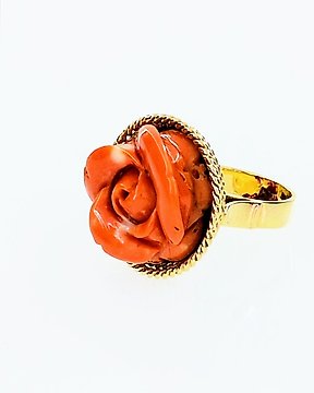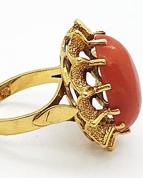 Anello - 14 carati Oro giallo, Anello in oro giallo 14K con cabochon di corallo rosso Corallo